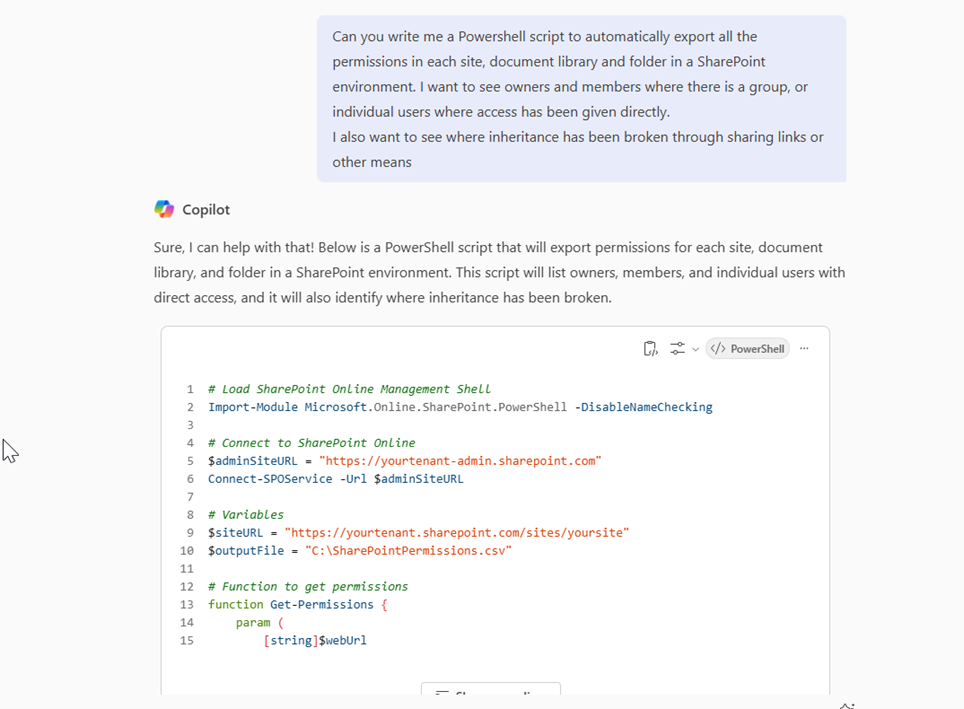 Copilot has helped me automate routine tasks that would otherwise take up a significant portion of my day. This includes monitoring and reporting of SharePoint environments, which is a crucial part of any SharePoint administrator’s role. For example, I can ask Copilot to create PowerShell scripts to generate SharePoint permission reports, or even setting up new SharePoint sites and Document libraries. This automation not only saves time but also reduces the risk of human error.